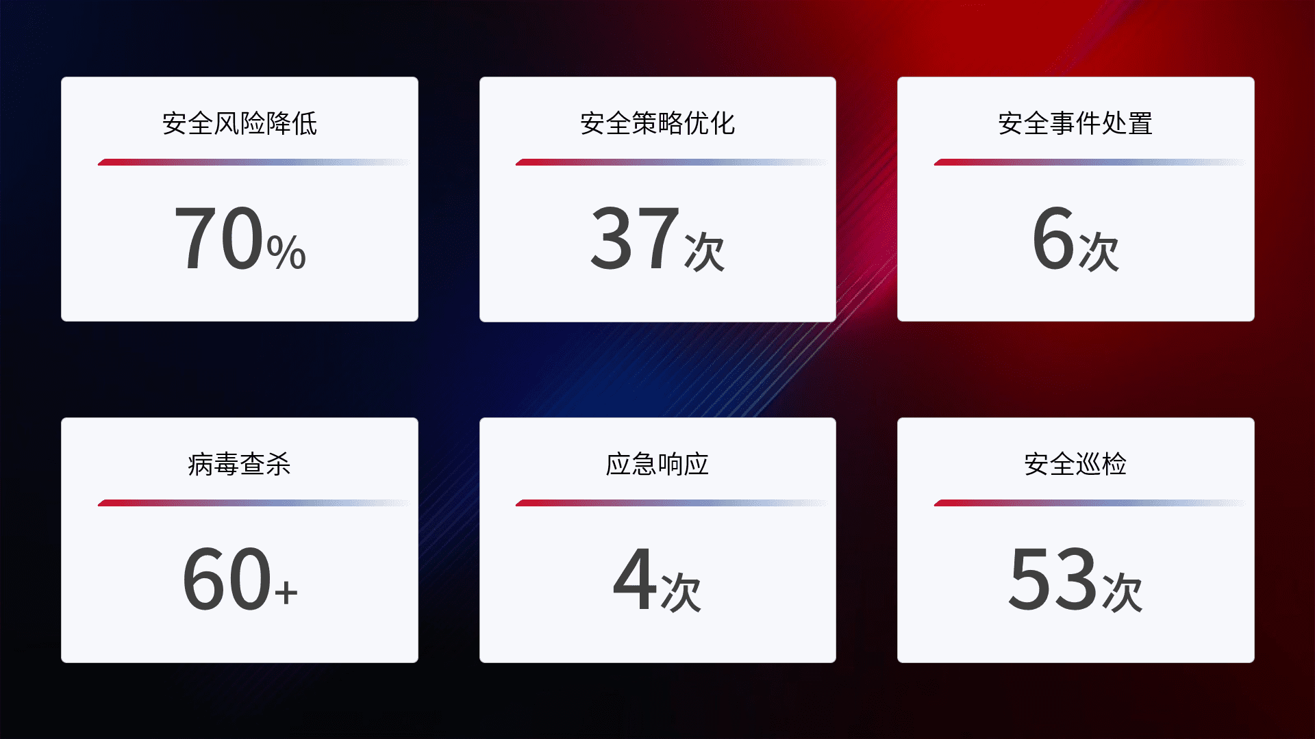 提供全面的安全事件报告体系,,,,包括处置报告、、周报、、、、季度和年度总结,,,,结合持续监控,,,帮助客户深入了解网络安全状况。。。。